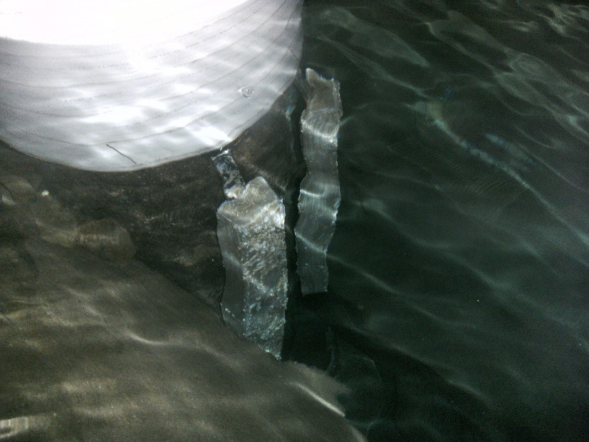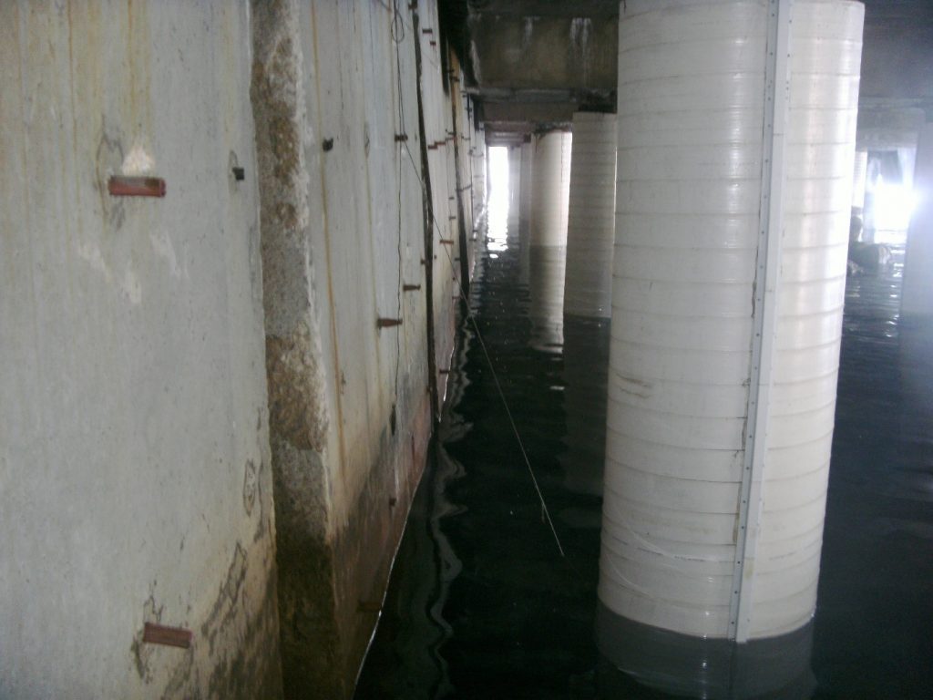 These reactions, shown in the drawings above, explain the severe corrosion that occurs under many sheath systems. The SplashShield® protective sheath system developed to solve all these problems consists of a high physical, chemical and UV resistant, T-ribbed uPVC coating and e-Grout® that forms an alkaline electrolyte inside.